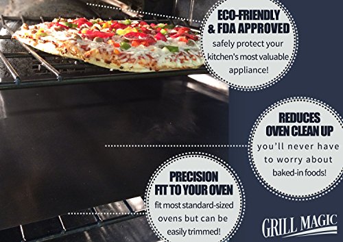 - ECO FRIENDLY: Do not curl, crack, smoke or releases chemicals. These oven liners safely protect your kitchen’s most valuable appliance with no chemicals, and while wasting no energy. Grill Magic Oven Liners are 100% BPA and PFOA Free. E-book Included! Learn tips, tricks and more with free user guide ebook (link sent after purchase).