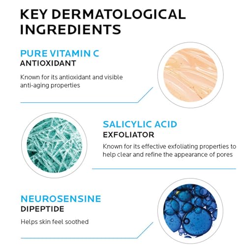Amazon is an authorized retailer of La Roche-Posay products. This La Roche-Posay Vitamin C serum is formulated with 10% Pure Vitamin C, Salicylic Acid and Neurosensine. With anti-oxidant benefits from 10% Pure Vitamin C, this Vitamin C serum helps to visibly reduce the look of wrinkles and fine lines while also refining skin texture. This Vitamin C serum contains Salicylic Acid and Neurosensine, creating a triple anti-aging complex for optimal effectiveness and gentleness while also being suitable for sensitive skin. This serum features a dermatological active, booster, and buffer ingredient in its formula. With routine use, this anti-aging serum helps to reduce the look of wrinkles and fine lines. Skin looks smoother & more radiant, and skin texture appears more refined. Use this Vitamin C serum as a daily anti-aging serum to brighten skin, applying 3-4 drops every morning to the face and neck. Use alone or as an added boost to your favorite moisturizer. This serum has a rich serum texture that leaves skin feeling softer, brighter & more hydrated. This anti-aging serum is: suitable for sensitive skin, non-comedogenic, paraben-free and dermatologist tested. Product packaging may vary. Ingredients: AQUA / WATER / EAU, ASCORBIC ACID, CYCLOHEXASILOXANE, GLYCERIN,ALCOHOL DENAT., POTASSIUM HYDROXIDE, POLYMETHYLSILSESQUIOXANE POLYSILICONE-11, DIMETHICONE, PROPYLENEGLYCOL, PENTAERYTHRITYL, TETRAETHYLHEXANOATE , C13-14 ISOPARAFFIN, TOCOPHEROL, SODIUM HYALURONATE, HYDROLYZED HYALURONIC ACID, ADENOSINE, ACETYL DIPEPTIDE-1 CETYL ESTER, PEG-20 METHYL GLUCOSE SESQUISTEARATE, POLOXAMER338, SALICYLICACID,POLYACRYLAMIDE, TOLUENE SULFONIC ACID, AMMONIUM, POLYACRYLOYLDIMETHYL TAURATE, XANTHAN GUM, CAPRYLYL GLYCOL, DISODIUM EDTA, BHT, LAURETH-7, PARFUM / FRAGRANCE (CODE F.I.L.: C232652/1