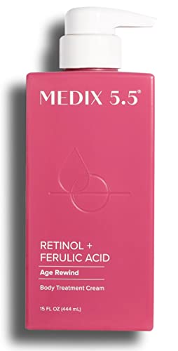 - EFFECTIVE ANTI-AGING INGREDIENTS – Medix 5.5 Retinol Cream is infused with Ferulic Acid, Shea Butter, Vitamin E, & Green Tea, which all work together to effectively firm skin + reduce the appearance of sun damaged skin, wrinkles, fine lines, & crepey skin. Aloe Vera defends against visible redness & irritation. Green Tea + Chamomile guards against environmental damage & reduces puffiness. Combination of ingredients make this Retinol Body Cream non-irritating unlike many other retinol products.