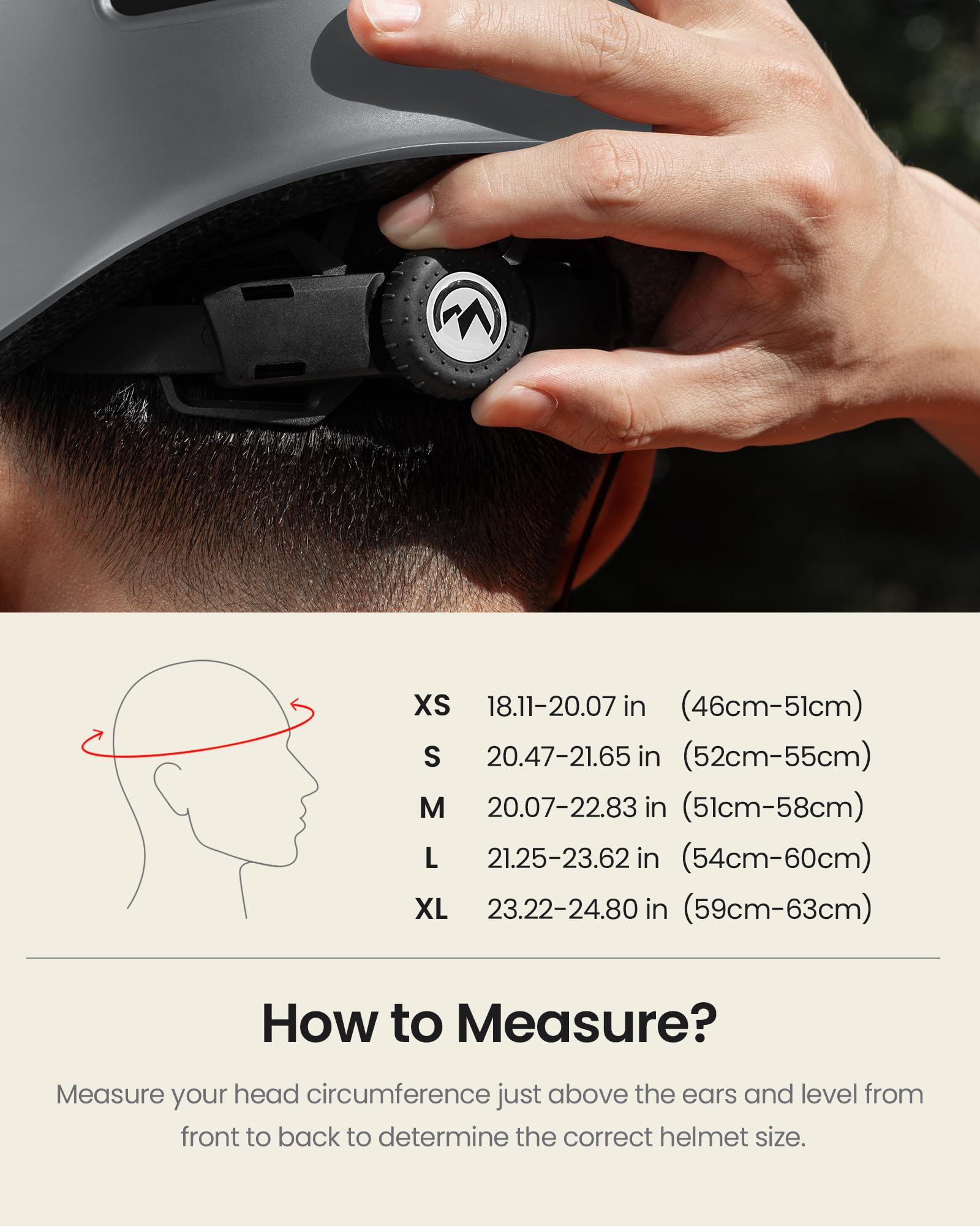 - HOW TO MEASURE A PROPER HELMET? – To find the right size bike helmet, start by measuring your head circumference, wrap a flexible tape measure around the largest portion of your head—about one inch above your eyebrows. Or, wrap a string around your head, then measure the length of string with a yardstick. Size Large is recommended if your size is between 21.3-22.8inch (54cm-58cm).