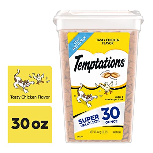 - Contains one (1) 30 oz. tub of TEMPTATIONS Classic Cat Treats Tasty Chicken Flavor