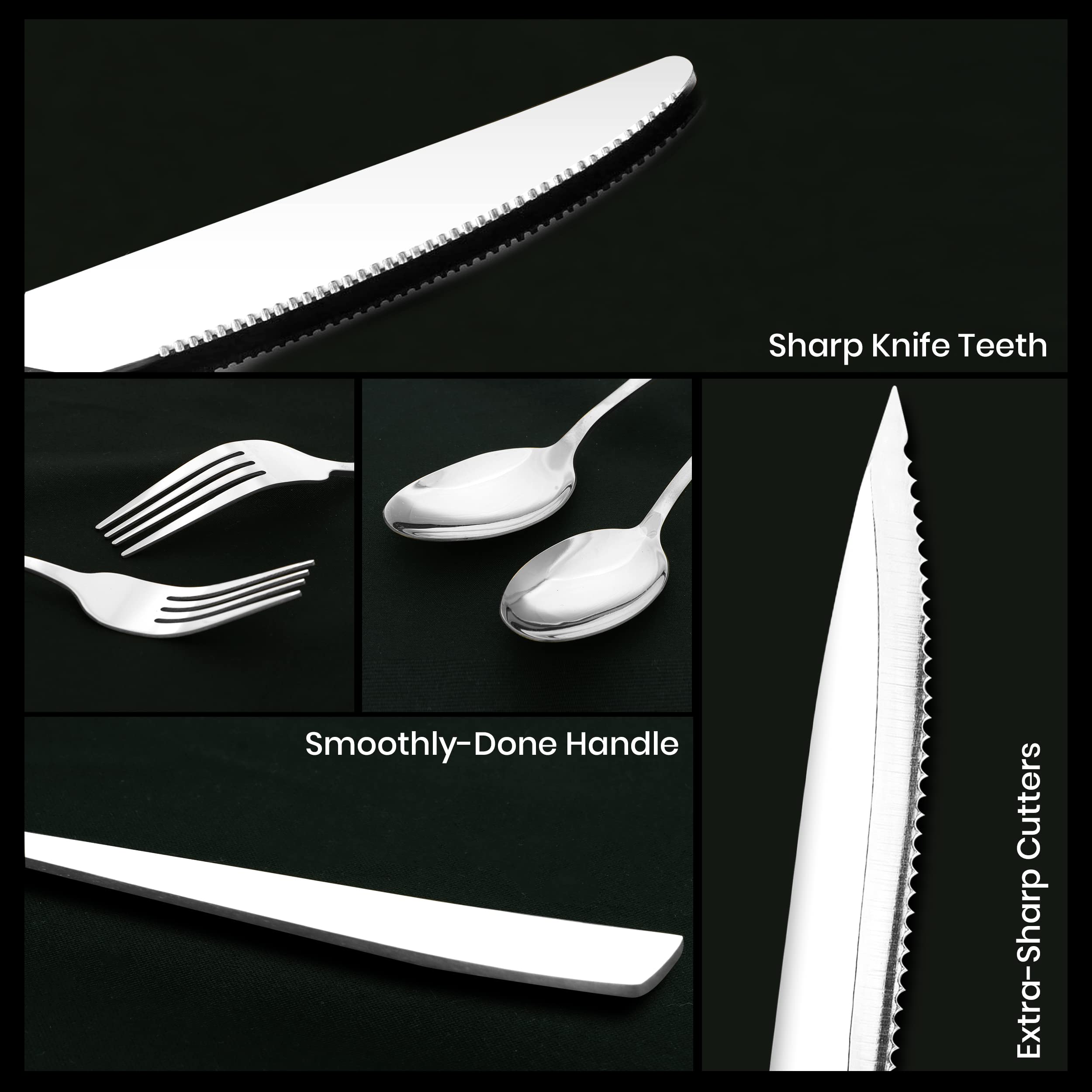 • 24 PCS SILVERWARE SET SERVICE FOR 4 – Our complete Flatware Set includes 4 units of Dinner and Steak Knives, Dinner Spoons and Forks (L and S), and Tea/Dessert Spoons. The Kitchen Sets for Home are an indispensable dining accessory that adds value to any dining experience.
